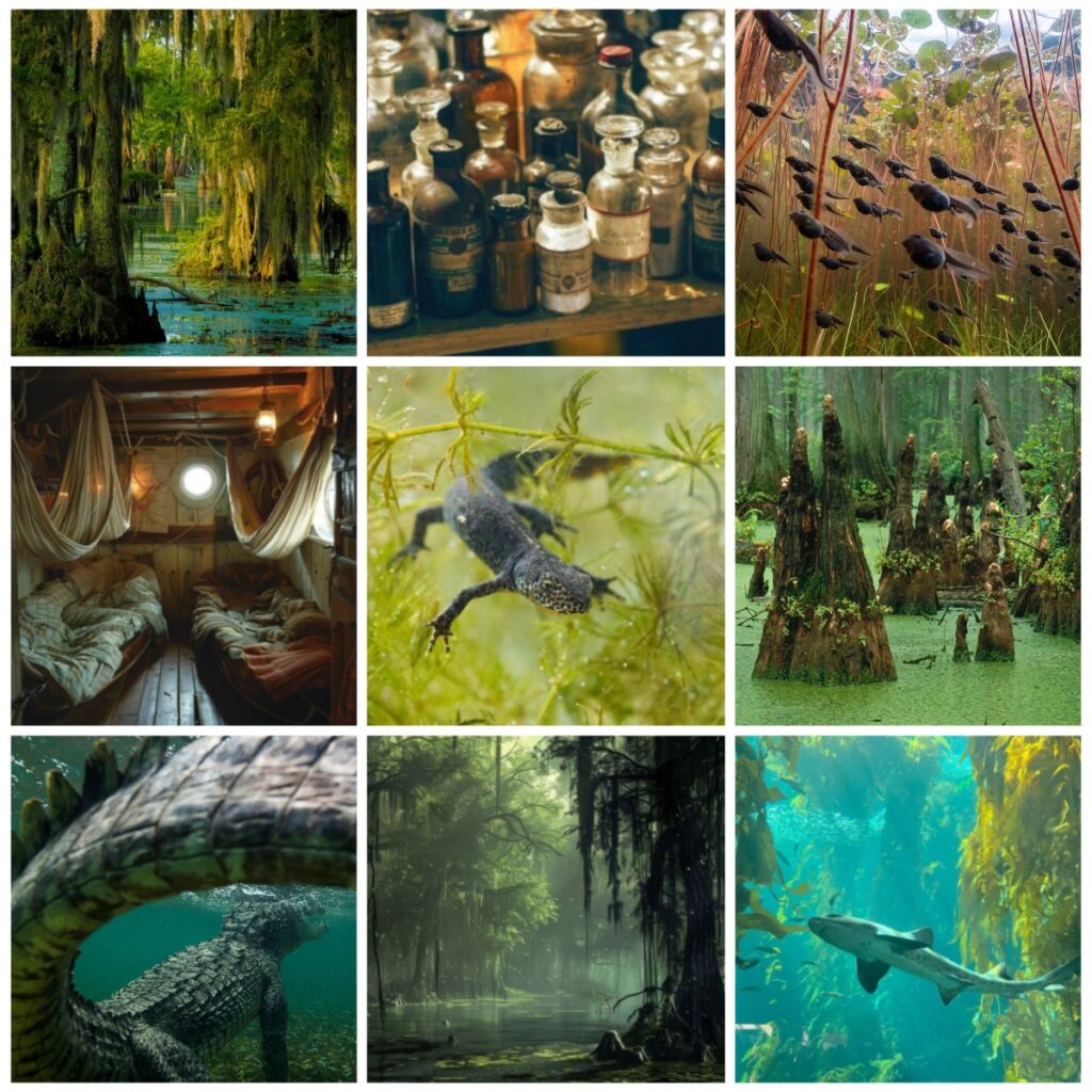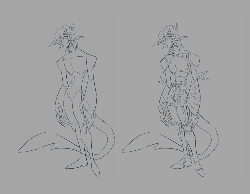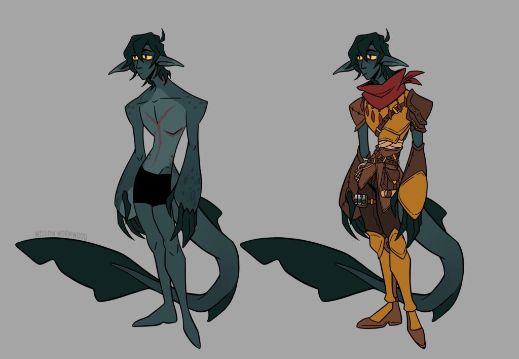In d&d simic hybrids are elves/humans/etc have been magically fused with other life forms like animals, so I tried to include aspects of aquatic animals, mostly sharks and newts, for the design. I ended up leaning more towards shark for the tail, but for the arms tried to resemble the way newts arms get kinda broad at the end.